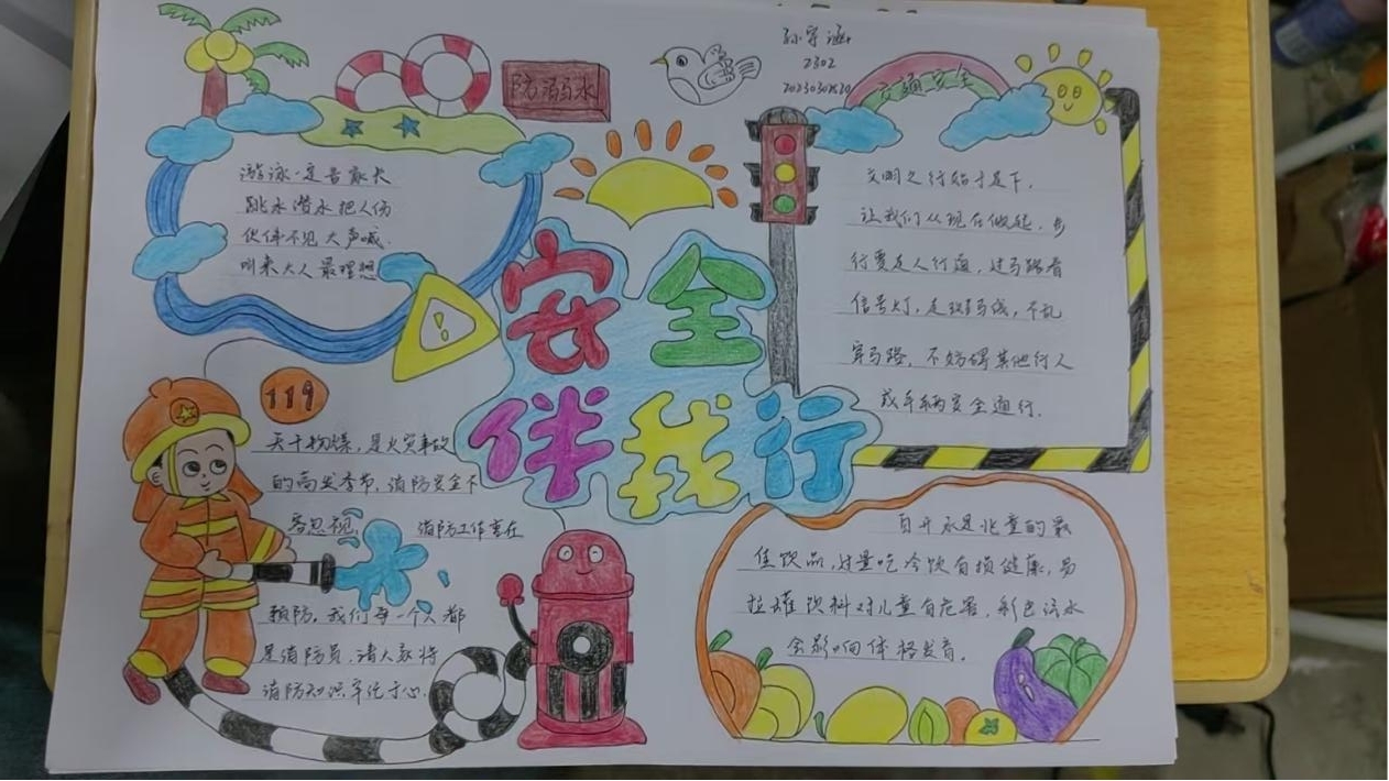 活动围绕交通安全、消防安全、食品安全展开。征文类作品中,同学们或讲述校园消防演练的亲身经历,或剖析食品安全隐患的社会案例,以文字传递对安全的深刻思考;手抄报创作里,大家巧妙布局版面,用鲜明色彩呈现安全知识科普,如电动车充电注意事项、食物中毒急救方法,还融入安全警示案例与“平安是福,安全为基”等标语,让A4纸成为安全宣传的生动窗口。
